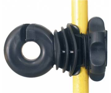 L'isolatore per i pali in metallo e PFV è destinato a fili, corde e nastri fino a 12 mm. E' un anello di grande diametro che consente il passaggio di noi e connessioni nel passaggio del conduttore. Si adatta a picchetti di diametro da 8 a 14 mm liscio. Chiodatura su palo in legno possibile.